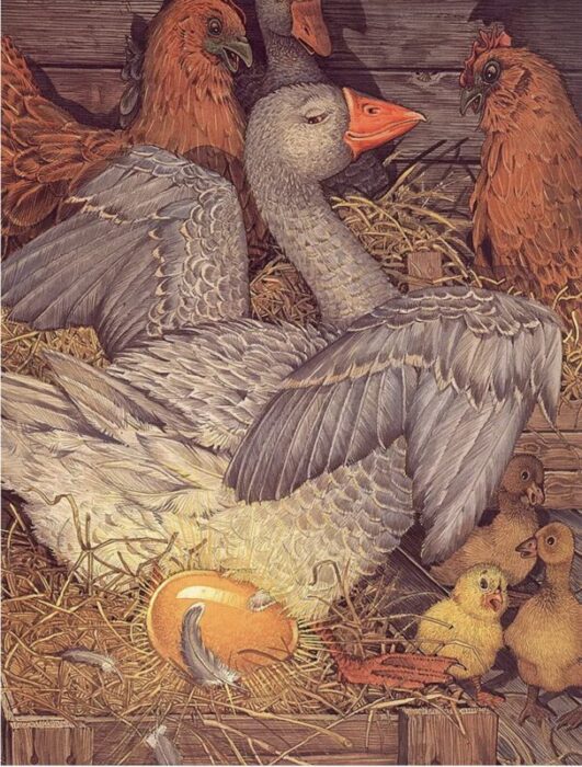 Lientje is door de ganzenmand gevallen, midden op de klinkerweg en roept iedereen om hulp en belooft dan gouden eieren , helaas voor haar achterban.